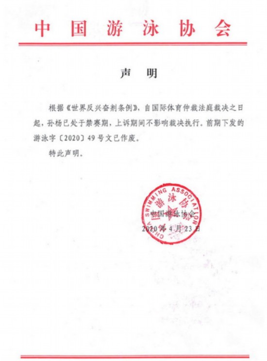 中國泳協:孫楊已處於禁賽期 上訴期間不影響裁決執行 新華社北京4月23日電 日前有媒體報道稱,孫楊入選備戰奧運會的國家游泳隊集訓名單,對此,中國游泳協會23日發表如下聲明予以澄清:.…