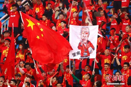 上周,國足在主場戰勝韓國隊,現場觀眾擎起中國隊主教練裡皮的漫畫像。 中新社記者 富田 攝