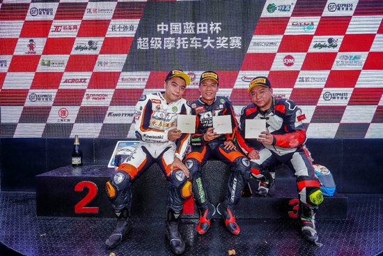 SS超級運動組,作為“冠軍收割機”的袁際博對天馬賽道比較熟悉,很輕鬆保持冠軍席位。而同樣來自天仕川崎車隊的林智飛獲得亞軍。袁際博說:“感謝我身后的車隊,這幾天天氣一直變換不定,機械師很辛苦換車胎,以及進行各種調校,昨晚也工作到很晚,拿到好的成績是我的職責,但真心感謝我的伙伴們。”