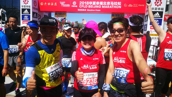 建輝專業而盡心盡責,看我狀態不錯,就不停地鼓勵我!在他的帶領下,前半程,我們保持6:40左右的配速,后半程有些掉速,但大多也在7分鐘多一點。還剩7公裡時,建輝告我,照這個速度有可能進5小時,要不要沖一把?當然要!雖然我已經很疲憊了,但還是毫不猶豫地鎖定了目標,不給自己鬆懈的理由。於是,一公裡一公裡地拼,一分鐘一分鐘地搏……終於沖過了終點!