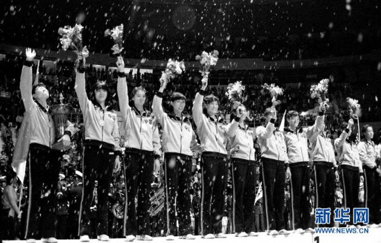 這是1982年9月25日,中國女排隊員在第九屆世界女排錦標賽頒獎儀式上向觀眾致意。 新華社發
