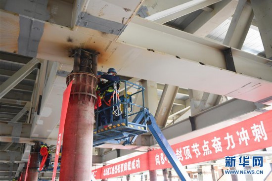 4月16日,施工人員在進行鋼結構桁架卸載。 當日,將作為2022年北京冬奧會主新聞中心(MPC)和國際廣播中心(IBC)場地使用的國家會議中心二期工程,完成國內最大規模鋼結構桁架卸載工作,向11月主體結構封頂目標邁出堅實一步。 新華社記者鞠煥宗攝