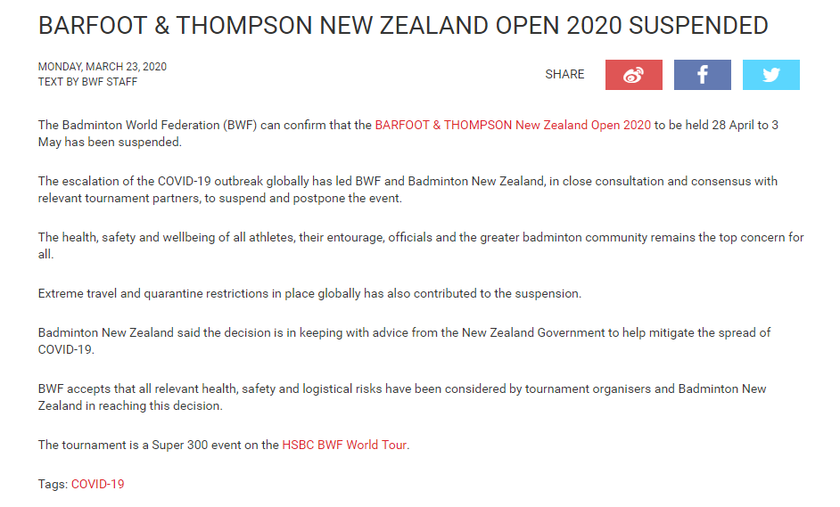 世界羽联宣布暂停新西兰公开赛 6月前将没有比赛 人民网北京3月24日电(赵欣悦)北京时间3月23日,世界羽联在官网宣布,因新冠肺炎疫情原因,将暂停原计划于4月28日-5月3日举行的新西兰公开赛。世界羽联表示,鉴于全球范围疫情升级,世界羽联同新西兰羽毛球协会以及相关比赛伙伴密切协商后,达成推迟比赛的共识。…