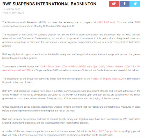 世界羽联取消4月12日前全部比赛 奥运积分赛新规稍晚公布 人民网北京3月14日电(赵欣悦) 北京时间3月14日,世界羽联发布公告,宣布暂停或推迟3月16日至4月12日的全部国际比赛。 世界羽联表示,由于新冠肺炎疫情在全球范围内的升级,考虑到所有运动员、随行人员以及官员的健康和安全,考虑到旅行和检疫等方面的限制,最终做出这个决定。…