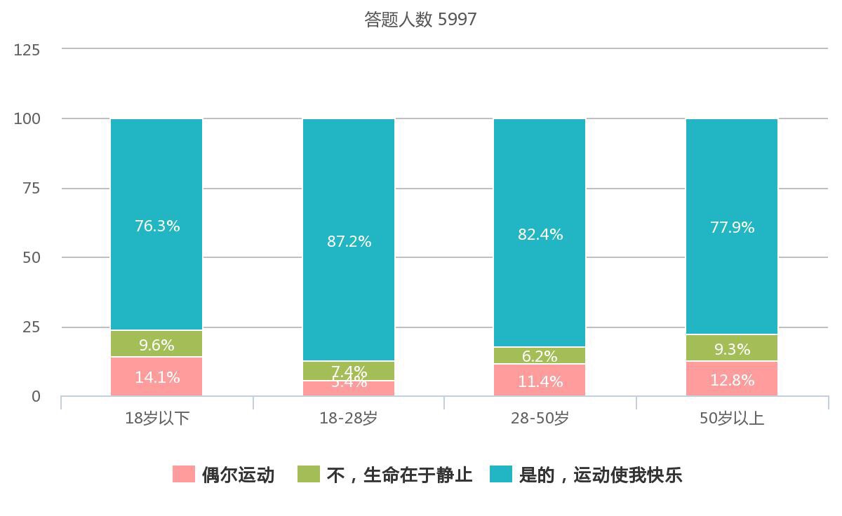 以不同年齡段作為分組依據的統計結果顯示,28-50歲人群中選擇參加運動的比例最高,達93.84%,高於 18歲以下年齡段的90.40%。問及當前健身與以往有何變化,60.58%參與者認為“健身群體的年輕化”是最大的改變。這一結果則說明80后已經成為健身人群的“主力軍”。