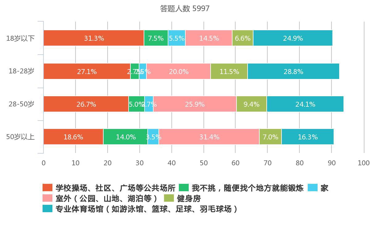 在健身場所的選擇方面,不同年齡的人也表現出不同的偏好:18歲以下參與者有31.33%的人選擇去學校操場﹔18-28歲有28.8%的人選擇專業的體育場館﹔ 28-50歲人群中選擇社區、室外的最多,共計52.55%﹔50歲以上人群則主要選擇公園、湖泊等室外場所。不同年齡段人群選擇健身場所的差異體現出他們不同的健身需求和健身喜好。
