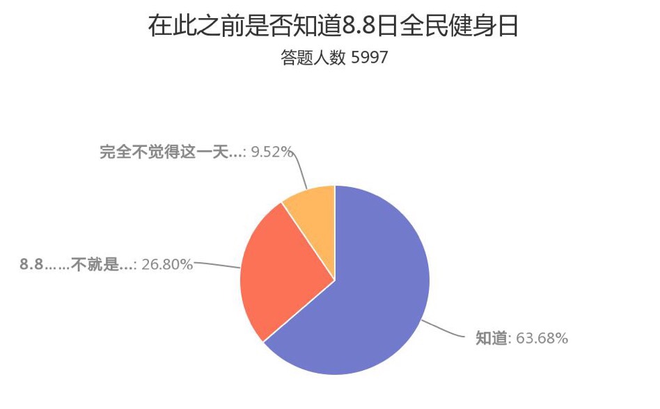 2018年的8月8日是第十個“全民健身日”,為了解全民健身現狀、描繪健身人群畫像,人民體育發起了以“全民健身”為主題的調查問卷,問卷共設置19道選擇題和1道主觀題,從健身頻率、時長、方式、變化等方面入手,收集和統計不同性別、年齡、職業人群健身偏好和看法。問卷在微信、微博等網絡公共平台發布,最終收回有效樣本5997份,以下為具體情況: