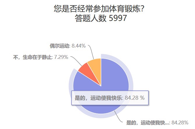 在“您是否經常參加體育鍛煉”一題中,84.28%的參與者表示自己經常參與運動,並認為 “運動使我快樂”,8.44%表示偶爾運動,僅有7.29%的人選擇了“不運動”。總體來看,參與運動和健身成為當前大眾生活的一大主流。