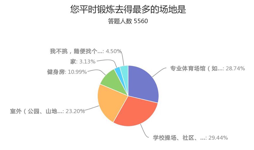 有關健身場所的調查結果顯示,63.92 %的參與者表示距離自己最近的健身場地在1000米以內,僅有11.96%的人表示在2000米以內沒有健身場所。健身場地類型方面,利用學校操場、社區廣場等公共區域進行健身人群佔比最大、達29.44%,室外場所及專業體育場館分別為23.2%和28.74%,三組數據的差距並不大。這顯示出全民健身場地設施的普及度和多樣化為大眾運動提供了“地利”。