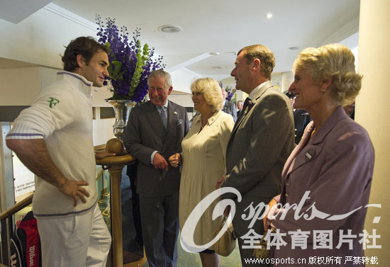 资料图片:2012年温网 查尔斯王子(左二)夫妇造访 与费德勒热聊
