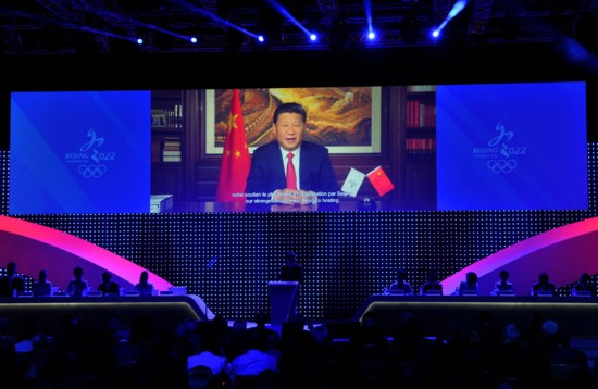 2015年7月31日,在国际奥委会投票表决前,国家主席习近平通过视频向国际奥委会委员致辞。新华社记者 公磊 摄