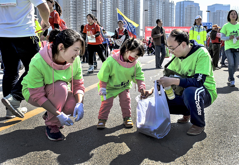 这一家三口身着统一的服装,正在捡拾赛道上的垃圾,小女孩脸上贴着国旗,一脸的认真和专注,一举一动证明了爱护环境的意识已经深深植入了小女孩的内心。