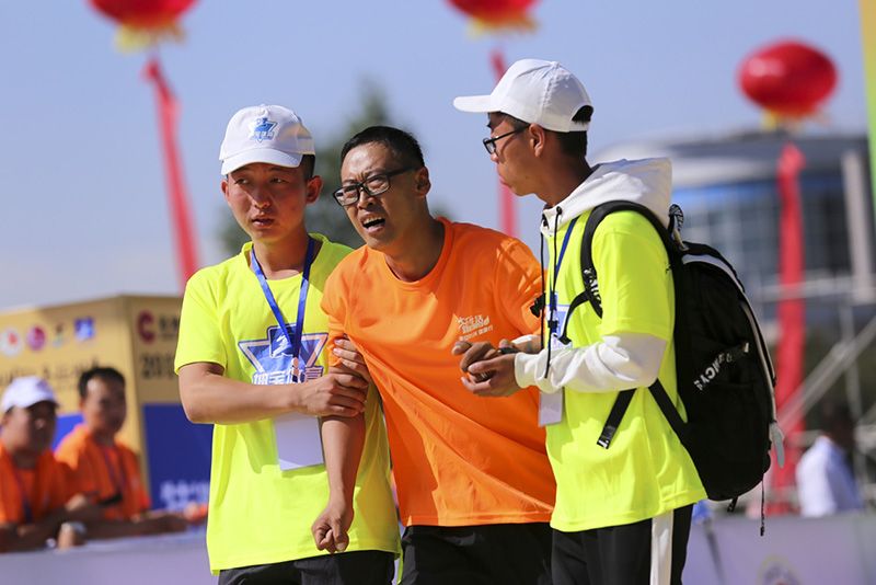 一位参赛的跑者已经没有体力支撑到完赛,甚至连走路都变成一件困难的事,为了他的安全考虑,两位年轻的志愿者即刻搀扶住他去休息,像这样的志愿者在赛道上随处可见。