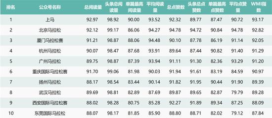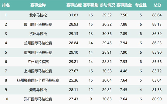 排行榜从舆情热度、赛事级别、参与情况、奖金情况、专业性五大维度进行评估,共涉及40余项具体的评估指标。北京马拉松、厦门国际马拉松赛、杭州马拉松、兰州国际马拉松赛、重庆国际马拉松赛、广州马拉松赛、上海国际马拉松赛、扬州鉴真国际半程马拉松赛、无锡马拉松、郑开国际马拉松赛分列第一至十。
