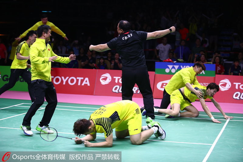 3-1,当汤姆斯杯中日对决比分定格的那一刻,全体中国将士一齐冲进场内,他们尽情欢庆,激情拥抱,开赛以来背负的压力终于得以释放,这个冠军他们等了太久。