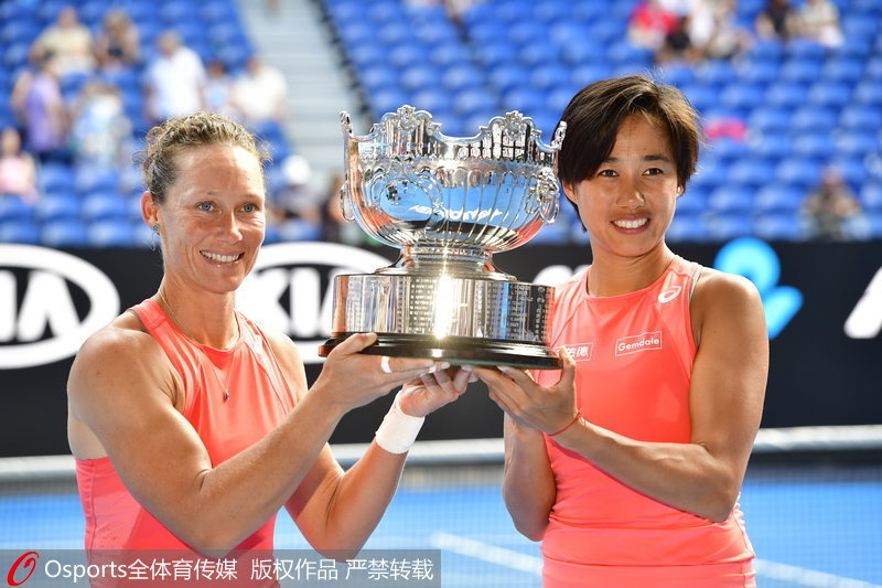 人民网北京1月26日电 北京时间1月25日,2019年澳大利亚网球公开赛女双决赛打响,中国金花张帅与澳大利亚选手斯托瑟的跨国组合以6-3/6-4战胜卫冕冠军、2号种子巴博斯/梅拉德诺维奇,夺得大满贯冠军!
