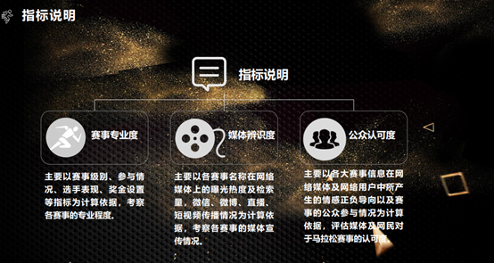 与往年相比,之前的考察指标仍在评估体系内,本次榜单是对往年的指标结构进行了整合重组,根据指标特点把其归到赛事专业度、媒体辨识度、公众认可度三个方面。