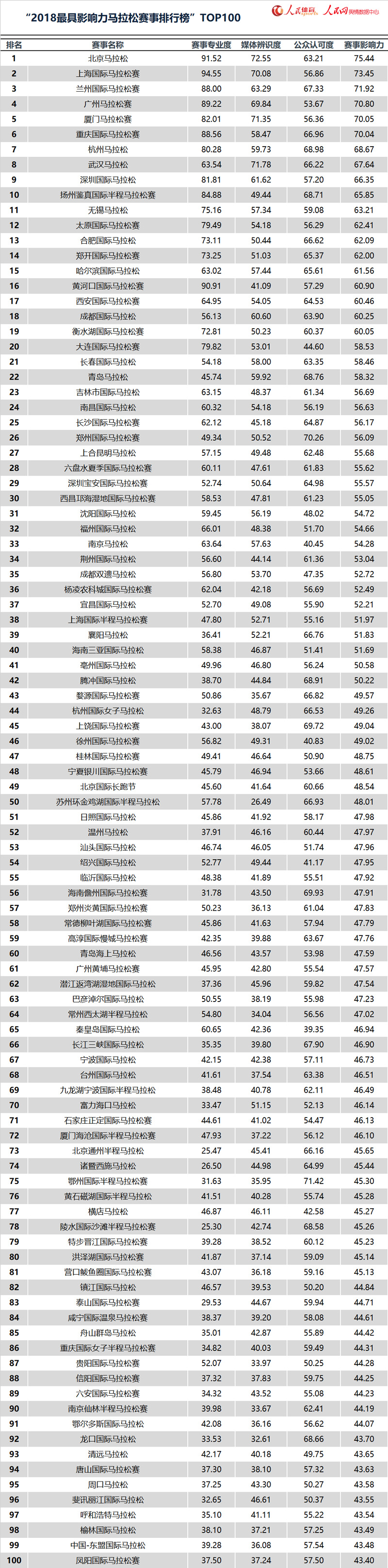 附:“2018最具影响力马拉松赛事排行榜”TOP100