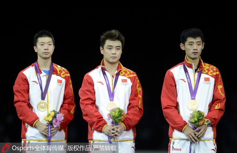 2012年8月8日,乒乓球男团决赛,中国3:0韩国。赛后马龙、王浩、张继科合影留念。