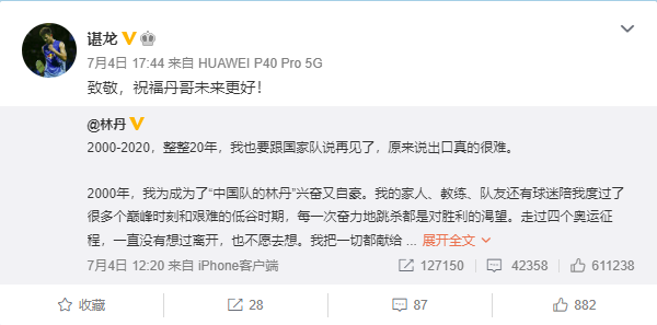 林丹退役后,国羽男单主力谌龙和石宇奇的责任变得更大,他们将带着林丹的精神,延续国羽男单组的辉煌。二人分别发布微博致敬林丹,并祝福他以后一切都好。