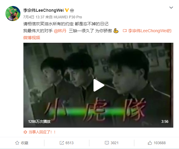 林丹、李宗伟、陶菲克、盖德并称羽坛四大天王,林丹退役后,四大天王的时代也正式落幕。马来西亚名将李宗伟与林丹是一生的对手、一世的朋友,得知好友宣布退役,李宗伟在微博转发了小虎队的MV,并表示:“请相信欢笑泪水,所有的约定都是忘不掉的日记,我最伟大的对手,三缺一很久了,为你骄傲。”
