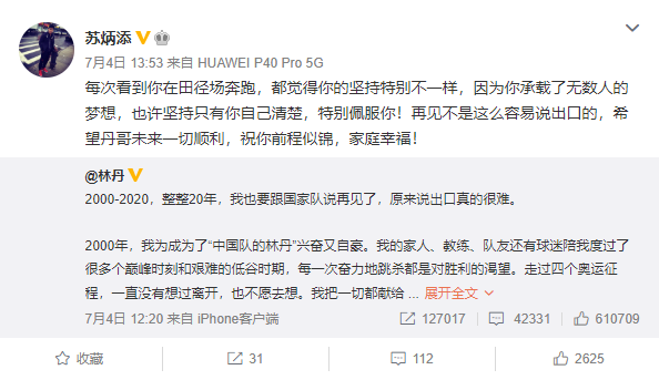 除了羽坛明星的祝福,中国短跑名将苏炳添也转发了林丹的微博,称赞道:“每次看到你在田径场奔跑,都觉得你的坚持特别不一样,因为你承载了无数人的梦想,也许坚持只有你自己清楚,特别佩服你!再见不是这么容易说出口的,希望丹哥未来一切顺利,祝你前程似锦,家庭幸福。”