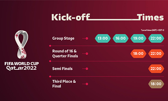按照赛程安排,揭幕战将于当地时间2022年11月21日13时在海湾体育场进行。小组赛阶段所有的比赛将于当地时间13时、16时、19时和22时四个时间点展开,确保球队拥有最佳赛程间歇时间。淘汰赛阶段比赛将于当地时间18时和22时进行,半决赛在当地时间的22时进行,而决赛则将于当地时间18时(北京时间周六晚23时)在卢塞尔体育场进行。