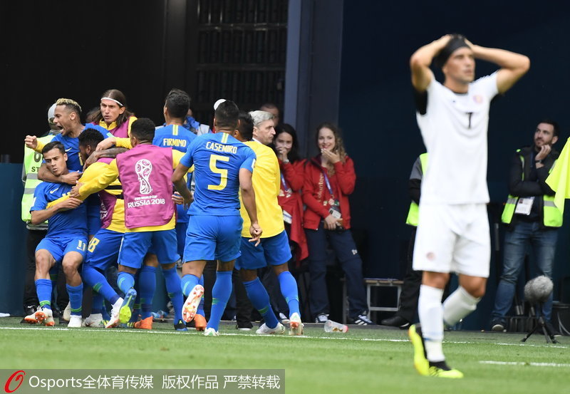 人民網北京6月22日電 北京時間20:00,俄羅斯世界杯小組賽第二輪E組,巴西對陣哥斯達黎加的比賽在聖彼得堡進行。本場比賽常規時間雙方均未進球,補時階段,庫蒂尼奧與內馬爾先后破門。最終巴西2-0戰勝哥斯達黎加。